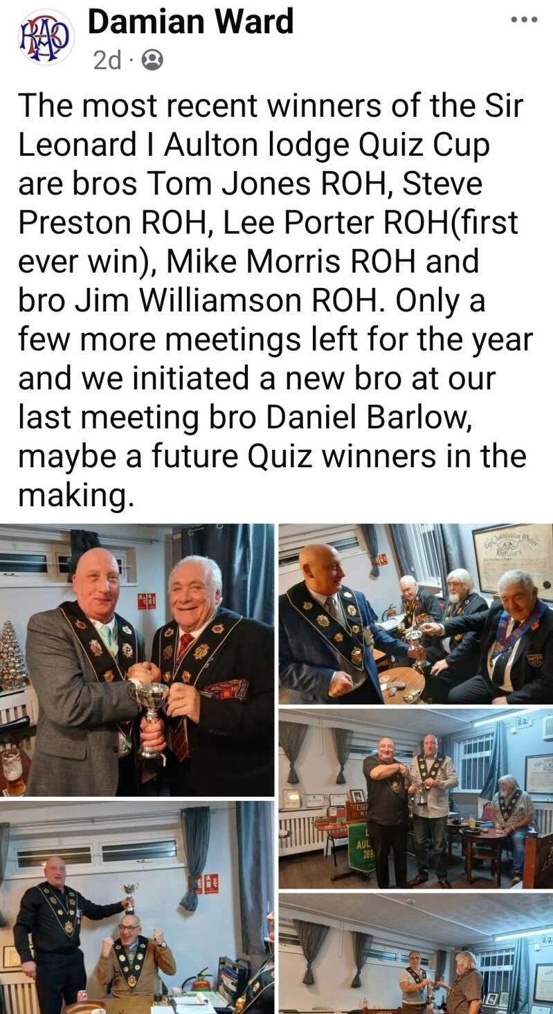 Weekly quiz events are held in the Sir Leonard I Aulton Lodge @ Trench Social Club on a Thursday night at 8pm with all visiting Brethren welcome after the PRIZED QUIZ TROPHY.....