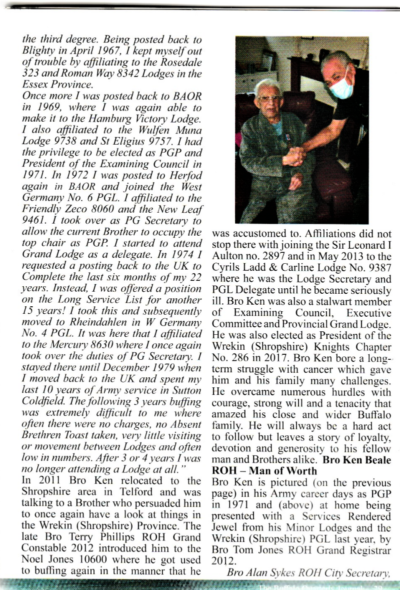 Bro Derick has inspired many Brothers in the Provinces he has worked within. He has led an extremely busy and noteworthy life, helping to raise money for countless charities and organised lodge outings galore over the years (back in the day often driving the bus!). He thoroughly deserved the respect of his colleagues and peers as well as the many honors bestowed on him during 60 plus years of unbroken compliance. In the last year of his life, whilst confined to his bed at home, he was still visited regularly and kept in touch with Brethren to keep him abreast of Province news and its social functions. He was always quick to donate raffle prizes and bottles of cheer until he passed away two days after his 89th birthday. Brother Derick Haywood ROH HM was a distinguished stalwart member of the Wrekin (Shropshire) Province and an ambassador of all things Buffalo, that will be dearly missed.